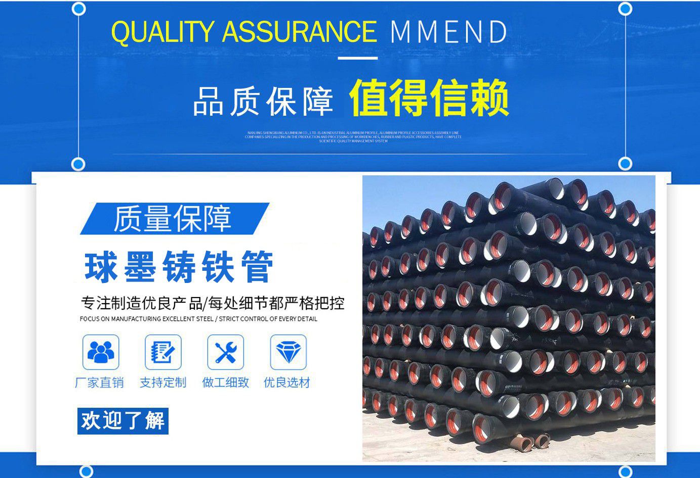 山西飛翔鑄業有限公司是一家以新興技術致力于研制開發、生產、銷售、施工安裝各種球墨管廠家,球墨鑄鐵管價格,國標球墨管,k9球墨鑄鐵管,國標球墨鑄鐵管,離心球墨鑄鐵管等系列鑄鐵產品。公司擁有完善的銷售、售后服務體系及一支由鑄造專家、工程師組成的精通產品設備和生產鑄造的技術力量隊伍。隨著企業的發展,我們積累了豐富的鑄造經驗與科技水平。使得產品具有高強度、高韌性、耐腐蝕性強等性能。同時,我們獲得質量管理體系認證、產品質量認證、職業健康體系認證、環境管理體系認證。產品暢銷各地并打入韓國、新加坡等東南亞市場。 在未來的發展中,公司奉行誠信共雙贏,合作創盛世的企業理念。讓我們一起共創美好未來!  公司產品采用良好的工藝流程,以確保產品質量的穩定性:以良好的設備,確保質量的可靠性。廣泛應用于國內外城市的市政建設,通信,自來水,消防,園林,環保等行業,產品大獲贊譽!  我們有多年的井蓋生產經驗,多名老技術工人有將近二十年的生產經驗,還聘請多名新技術研發人員,因為我們始終堅信質量才是未來生存的根本,只有把質量保證了,企業才會有更加美好的未來。公司堅持用心服務,誠信為本,與時俱進,科技為先的企業理念,堅持科技先導、竭誠為廣大用戶服務。歡迎各界朋友蒞臨我公司參觀,指導洽談業務,相信選擇我們就是選擇我們共贏的明天...